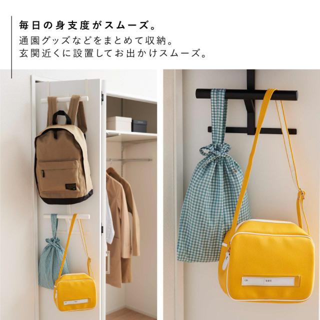 バッグ類なら、両サイドから肩ひもを通して掛けるだけ。普段床に置くのが気になっていた、ランドセルやリュックもすっきリと浮かせて収納できます。お子様の通園バッグや抱っこ紐などお迎えセット一式をまとめて収納しても。玄関周りに使って、お子様の帰宅時に通学グッズを掛けて、自然にお片付けする習慣付けにも。雨で濡れたリュックも浮かせて収納できます。