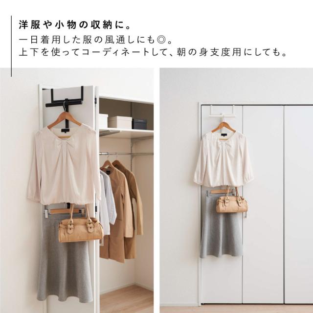 衣類ハンガーを掛けて、一日着用した服の風通しにも。上下2段を使ってコーディネートを考える時にも便利です。バッグや小物類も掛けて、翌朝の身支度用にセットしておいても◎。
