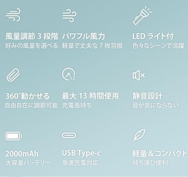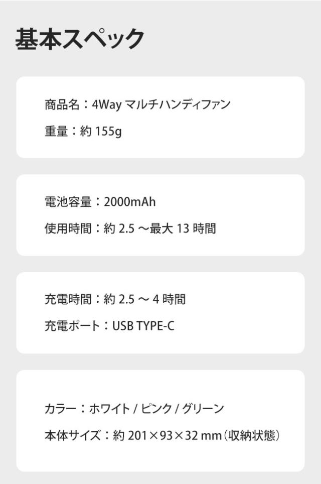 品番 r-e0016品名 4WAYマルチハンディファン入力 DC 5V 1.0A MAX消費電力 1.85W MAX最大風速 4.5m/s MAX充電電池 リチウムイオン電池内蔵バッテリー容量 2000mAh(7.4Wh/3.7V)充電時間 約2.5〜4時間ライト消費電力 0.1Wライト輝度 5-6lm使用時間 約2.5〜13時間本体重量 約155g