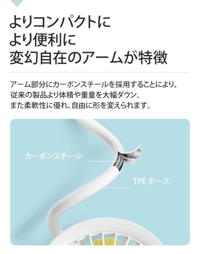 | ご注意 | ・故障や異常時には、直ちに使用を中止してください。発煙・発火・感電、ケガに至る恐れがあります。 ・安全にお使いいただく為に、ライトの光を目に直接当て続けないでください。人体に悪影響を及ぼす可能性があります。 ・分解、修理、改造しないでください。故障や感電、ケガをする恐れがあります。 ・ガードの中や可動部に指や異物を入れないでください。また髪の毛や衣類が巻き込まれないようご注意ください。ケガや故障の恐れがあります。 ・濡れた手で操作したり、本体を水につけたり、水をかけたりしないでください。故障の原因、また感電やショートする恐れがあります。 ・可動範囲を超えて調節アームを無理に曲げないでください。故障や破損の恐れがあります。 ・充電される際は必ず付属のUSBケーブルをお使いいただき、USBポートにしっかりと差し込んでください。 ・リチウムイオン電池の品質を保つ為、また寿命を延ばす為に充電をしたまま放置せず、充電が完了した際はUSBケーブルを抜いてください。 ・充電しながら使用しないでください。 ・落としたり、強い衝撃を与えないでください。故障や破損の原因となります。 ・お子さま、高齢者の方がお使いの際は必ず保護者の監督のもとでご使用ください。 ・お子さまや乳幼児の手の届く場所での保管はお避け下さい。思わぬ事故やトラブルの原因になります。 ・浴室など、湿度の高い場所でのご使用や保管をしないでください。感電やショートする恐れがあります。 ・炎天下の車内や暖房器具のそばなど、温度が高くなる場所で使用・充電・保管しないでください。発熱・発火・故障の原因となる恐れがあります。 ・不安定な場所に設置・保管しないでください。落下の恐れがあります。 ・ご使用されない場合でも、2〜3カ月に1回は充電を行ってください。 ・長時間、身体に風を当てないでください。健康を害する恐れがあります。 ・本来の用途以外で使用しないでください。 |