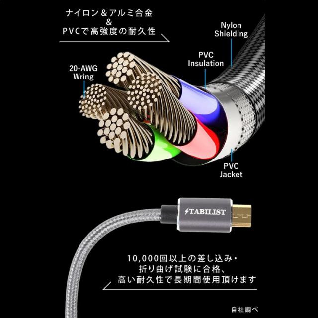 ・高い強度を誇るナイロン+アルミ合金+PVC製ケーブル:10,000回