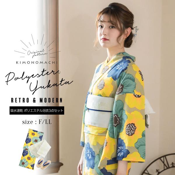 浴衣セット レディース 浴衣 3点セット (浴衣+帯+下駄)レディース 吸水速乾 ポリエステル浴衣「ライトカーキ ポピー」 Fサイズ LLサイズ レトロ モダン 大人 KIMONOMACHI オリジナル 【メール便不可】ss2512ykl10