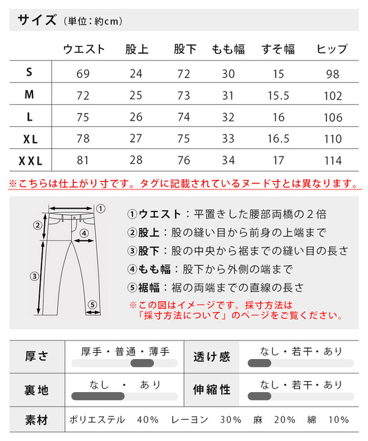 | サイズ | ウエスト | 股上 | 股下 | もも幅 | 裾幅 | ヒップ |