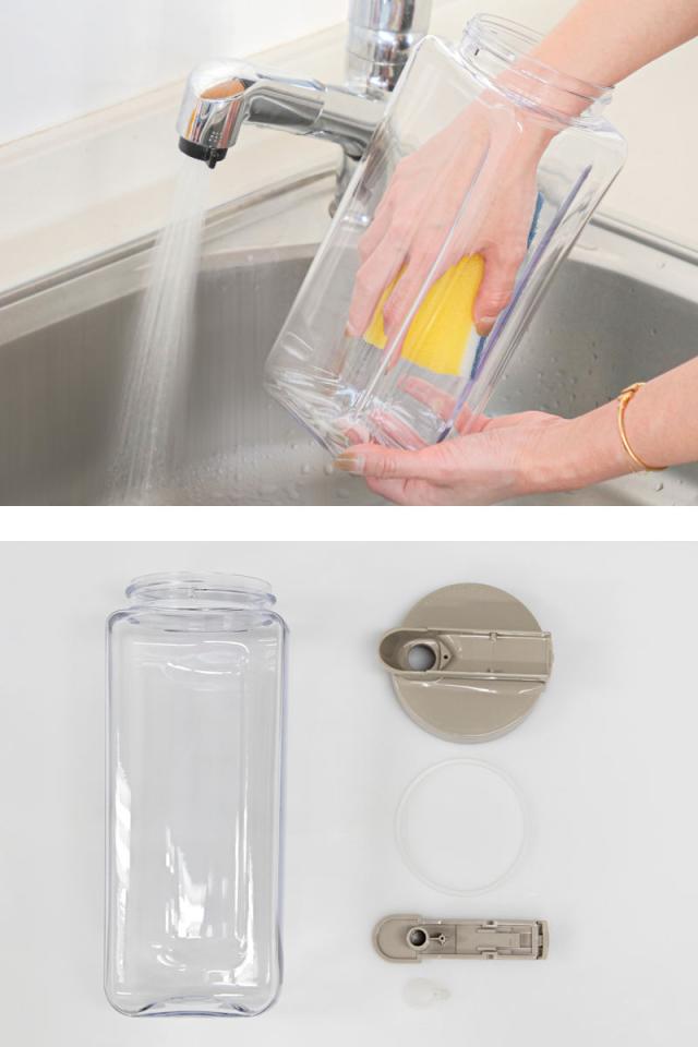 開口部分は広口設計なので、底まで手を入れて隅々までしっかり洗えます。また、全てのパーツが分解できて丸洗いできるので衛生的です。キャップ部分には茶渋が付きにくい防汚加工が施されています。