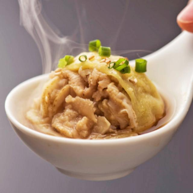 【原材料】餡(スープ(ゼラチン、コラーゲンペプチド、寒天加工品、でんぷん分解物、その他)、ホタテ(北海道産)、干し大根、調整ラード、合わせ味噌、オイスターソース、砂糖、食塩、玉葱)、皮(小麦粉(国内製造)、植物油脂)/調味料(アミノ酸等)、甘味料(ステビア、カンゾウ)、、クチナシ色素、(一部に小麦・大豆・豚肉・鶏肉・ゼラチンを含む)