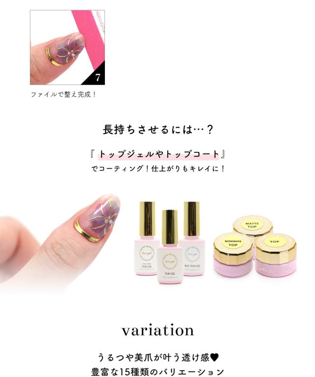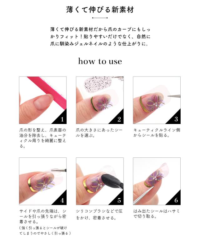 - 初購入でしたが、ベース・トップコートをして貼ると10日もちました!まだまだ剥がれそうにありませんでした。剥がす時もまだまだ粘着力あり、良かったです!また購入したいです!