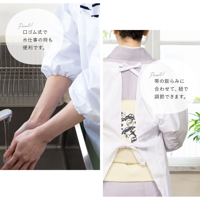 袖は和装の袖が入れやすいように広め、袖口はゴムで絞られた実用性の高いデザインです。