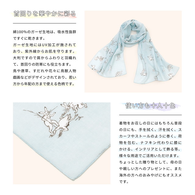 ガーゼチーフ ストール 大判 ショール スカーフ 日本製 uv TOIRO おしゃれ 和装 着物 鳥獣人物戯画 花唐草 すだれ セダム メール便 送料無料