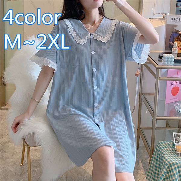 パジャマ レディース ルームウエア 春夏 半袖 前開き 綿 フリル パステルカラー ワンピ ワンピース ひざ丈 姫系 可愛い ガーリー 部屋着 寝巻き オシャレ きれいめ ゆったり リラックス 女子会 パジャマパーティー ホワイト ブルー