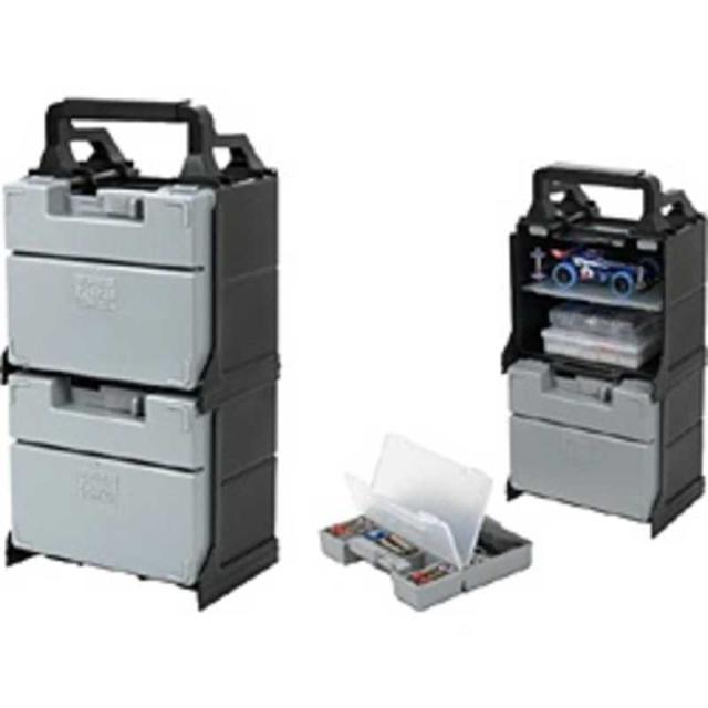 ミニ四駆を最大4台入れて持ち運べる、2段構造の樹脂製キャリングケース。マシンはもちろんパーツケースや電池、工具なども収納でき、レースに参加する時に便利です。上段、下段それぞれのドアボックスは2つの部屋に仕切られた構造で、電池や工具などが別に入れられます。さらにセンターのジョイントを外せば、マシン2台を収納可能なコンパクトなケースとしても使えます。