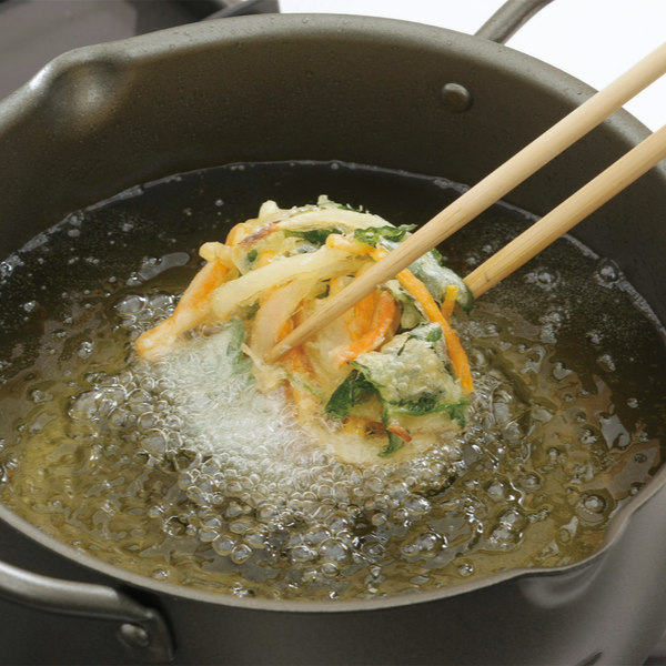 底厚2mmで油の温度が下がりにくく、カラッと美味しく揚がります。深さもあるので油ハネを抑えられます。揚げ油にごま油を30%ほど入れると、油がいたみにくく風味が増して軽く揚がり、さらに美味しく揚がります。