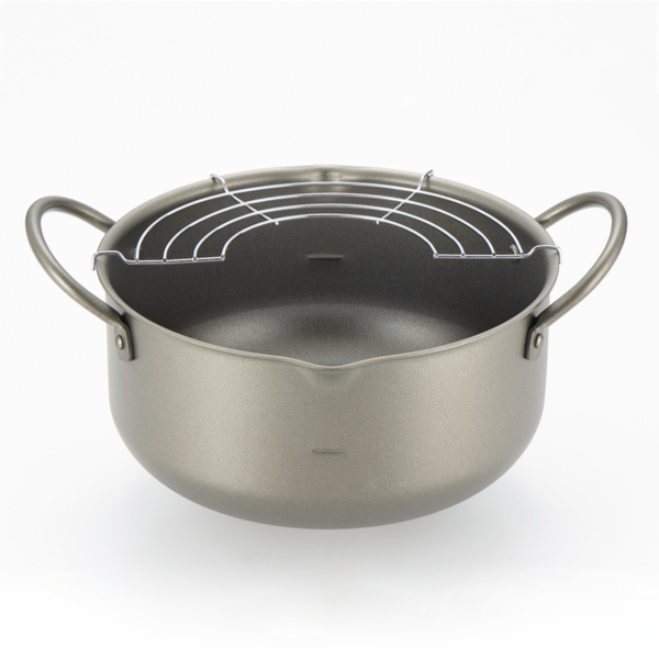 油ハネを抑える深型安心設計の鉄製天ぷら鍋です。油の目安となるラインが刻まれていて、調理がしやすいです。両口に注ぎ口も付いていて、油の移し替えにも便利です。すばやく油を切れるアミ付きです。ガスはもちろん、200VのIHやあらゆる熱源に対応しています。