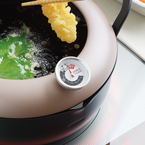数値が見やすい温度計のおかげで調理がしやすいです。注ぎ口が付いているので油の移し替えもラクラクです。油の目安となるラインも刻まれています。油温が急激に下がるのを防ぐため、具材を一度にたくさん入れないのが美味しく揚げるポイントです。