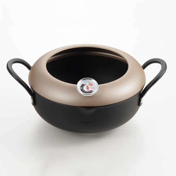 温度計付きの鉄製天ぷら鍋です。温度計付きで揚げ頃が分かりやすいので、美味しく仕上がります。ブラックを基調としたシックなデザインです。ガスはもちろん、200VのIHやあらゆる熱源に対応しています。