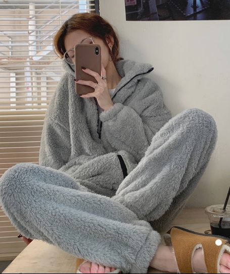 ルームウェア パジャマ ブルゾン もこもこ 可愛い オシャレ 楽 リラックス 暖かい スポーツ グレー 長袖 部屋着 お家時間 セットアップ 上下セット 秋冬 大人女子 シンプル クール かっこいい 人気