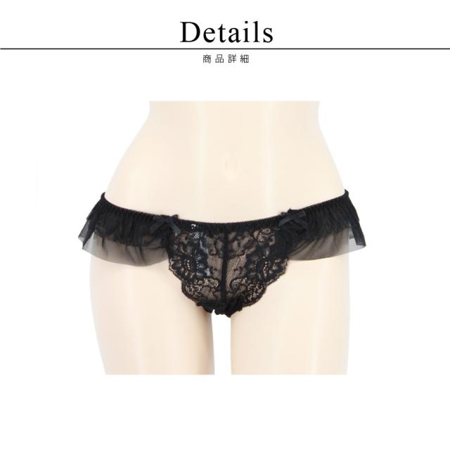 | フラワーレースやリボンのあしらいが愛らしいデザインながら、ヒップ部分にはスリットを入れて大胆な一面もちらり。 腰回りを柔らかに重ねたフリルで装飾し、華やかに仕上げました。 |