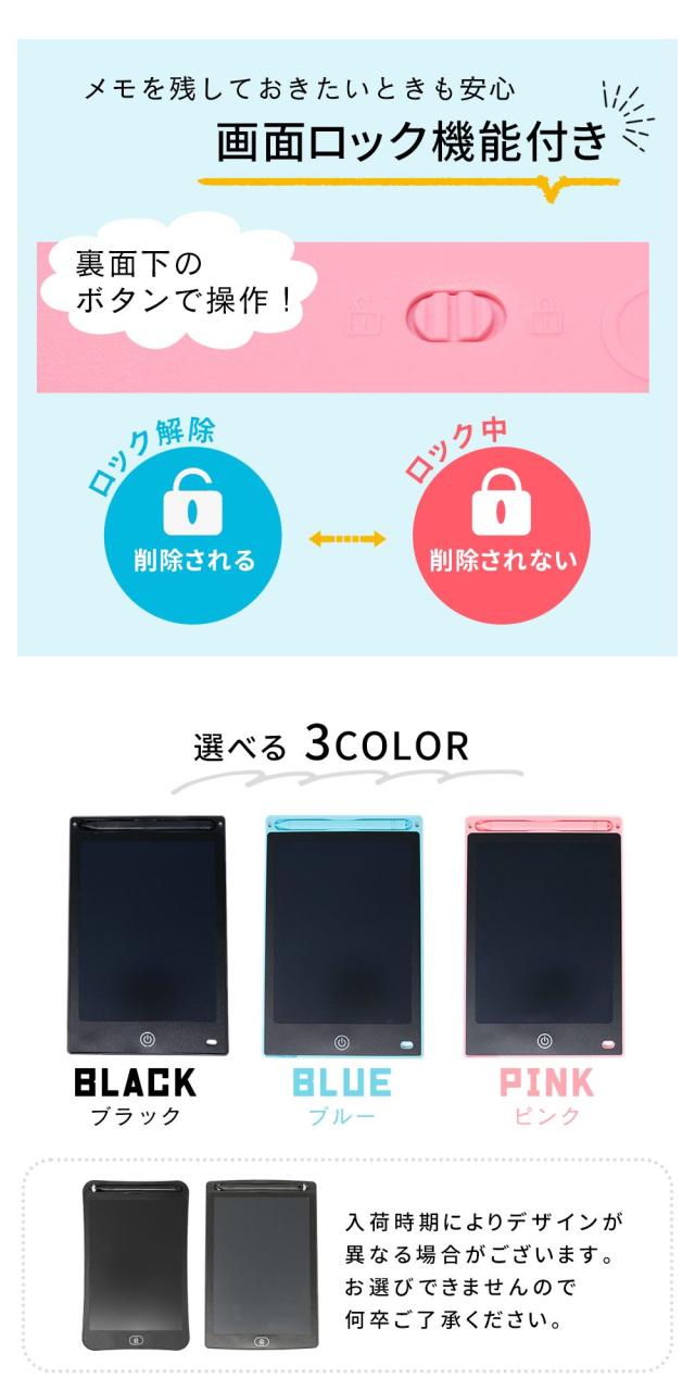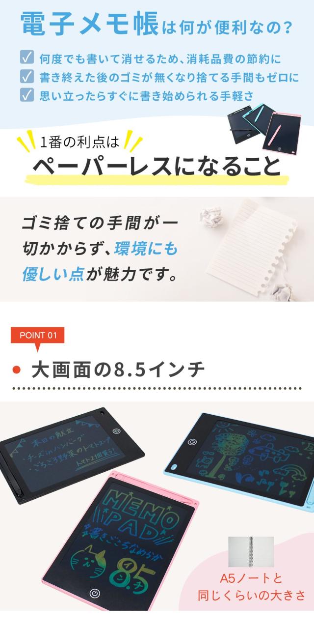 電子/電子メモ/電子メモパッド/8.5/8.5インチ/ワンタッチ/簡単/手軽/繰り返し/繰り返し可能/再利用/電子ノート/スマートノート/電子メモタブレット/タブレット/デジタルノート/ノート/デジタル/軽量/薄型/メモ帳/メモ/メモパッド/文房具/文具/筆記用具/おえかき/メニューボード/看板/8.5インチ電子メモ/削除ボタン/ロック機能/機能/タッチペン付き/手書き/メッツセージ/メッセージボード/献立/献立ボード/子供/キッズ/おもちゃ/ペーパーレス/二刀流