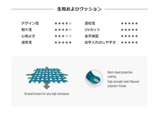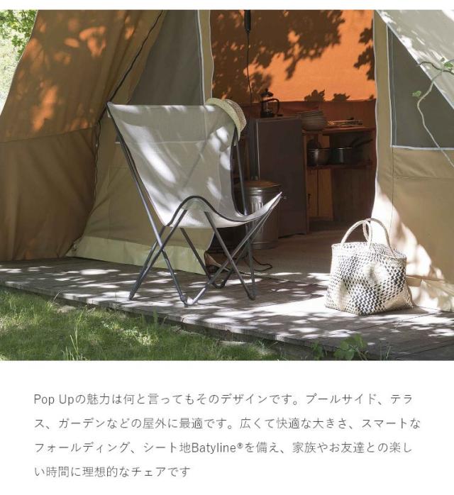 LAFUMA MOBILIERのCAMPINGシリーズ、MAXI POP UP チェア。一枚布で頭部と身体を受け止めてくれるこのチェアは、ハンモックかのように、体をすっぽりと包みこんでくれます。シート地には耐UV性、防カビ性、高い耐色堅牢度を備えたSerge Ferrari社のバティラインを採用し、屋外でも安心してお使いいただけます。また、室内で使う場合も考慮し、地面に設置する箇所にはエストラマー樹脂を使用。床面を傷つけにくい仕様です。