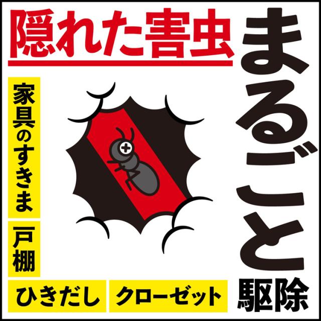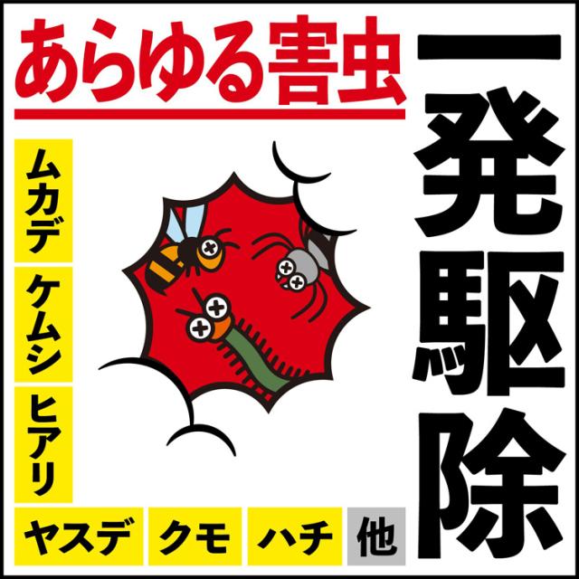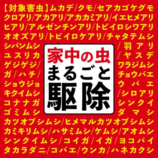 | 適用害虫:ムカデ(百足)、クモ(蜘蛛)、アリ(蟻)、チャタテムシ、シバンムシ、カツオブシムシ、ユスリカ、ヤスデ、ゲジゲジ、ワラジムシ、ガ(蛾)、ハチ(蜂)、ショウジョウバエ、チョウバエ、キクイムシ、シロアリ、コナナガシンクイなど |