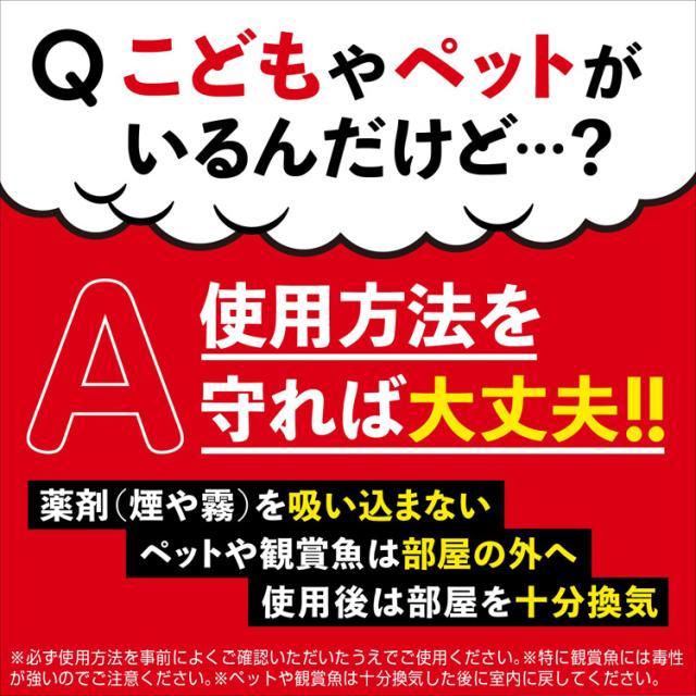 ・小鳥などのペット類、観賞植物は換気するまで部屋の外に出してください。また、観賞魚や観賞エビはエアーポンプを止めて完全密閉(水槽に覆いをして、ガムテープなどで密閉する)にして使用するか、部屋の外に出してください。使用後十分に換気をした後、ビニールを取り、エアーポンプを動かしてください。室外に出した水槽は、使用後十分に換気をした後で元に戻してください。