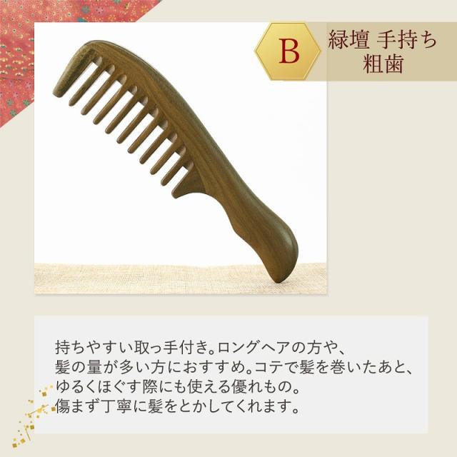 | 主な仕様 | 【サイズ】 A 緑檀 粗歯 長さ:約12.5cm 幅:約5cm B 緑檀 手持ち粗歯 長さ:約19.8cm 幅:約5.5cm C 緑檀 手持ち細歯 長さ:約18.9cm 幅:約5.5cm ※木の有機物の白い結晶がでてきた場合は、乾いた布で拭きとって下さい ※水洗いはしないで下さい ※天然素材の為、一つ一つお色や木目の出方が多少画像と異なる場合がございます ※「B 手持ち粗歯」はツギハギ部分がございますので、予めご了承下さい |