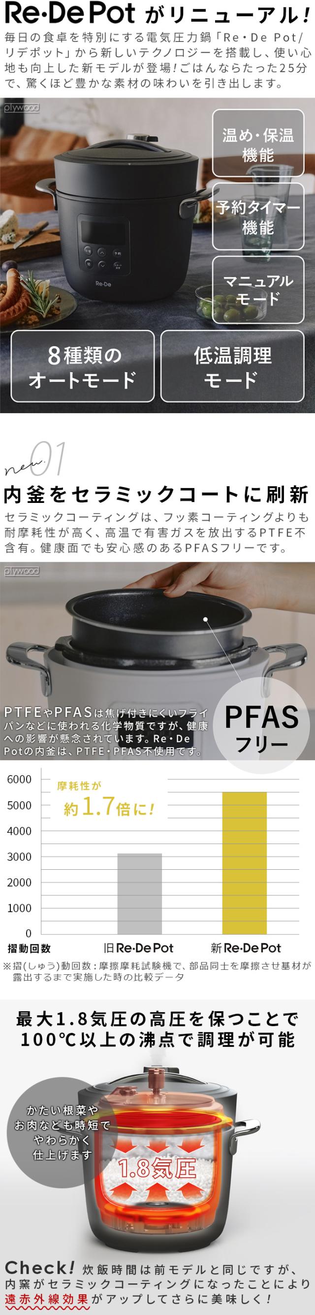 | ※2025年11月にモデル変更しました。 「Re・De Pot 電気圧力鍋 2L PCH-20L」の後継モデルです。旧モデルとはデザインや性能など仕様が異なります。 【変更箇所】 ・本体カラーリングが変更しました。 ・内釜コーティングをセラミックに刷新しました。摩耗性が前モデルに比べて約1.7倍になりました。 (セラミックコーティングになったことにより、遠赤外線効果がUPしより美味しくなりました。) ・最大12時間まで保温が可能になりました。 ・低温調理モードが大幅にグレードアップしました。 前モデル 40-100℃の10℃刻み 7段階 新モデル 30-100℃の5℃刻み 15段階 |