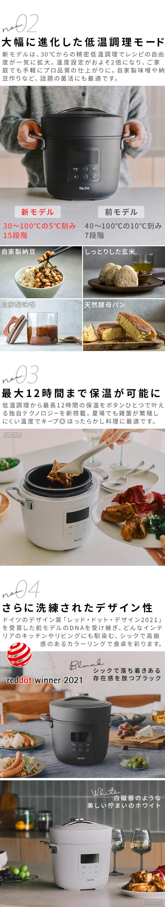 シリーズ累計11万台突破の信頼。愛され続ける電気圧力鍋Re・De Pot(リデポット)がリニューアルして登場!新テクノロジー搭載で、より使いやすくおいしく進化を遂げました。本格料理も、低温調理もボタンひとつで完成の手軽さ♪新モデルはさらにシックで高級感のあるカラーリングです。