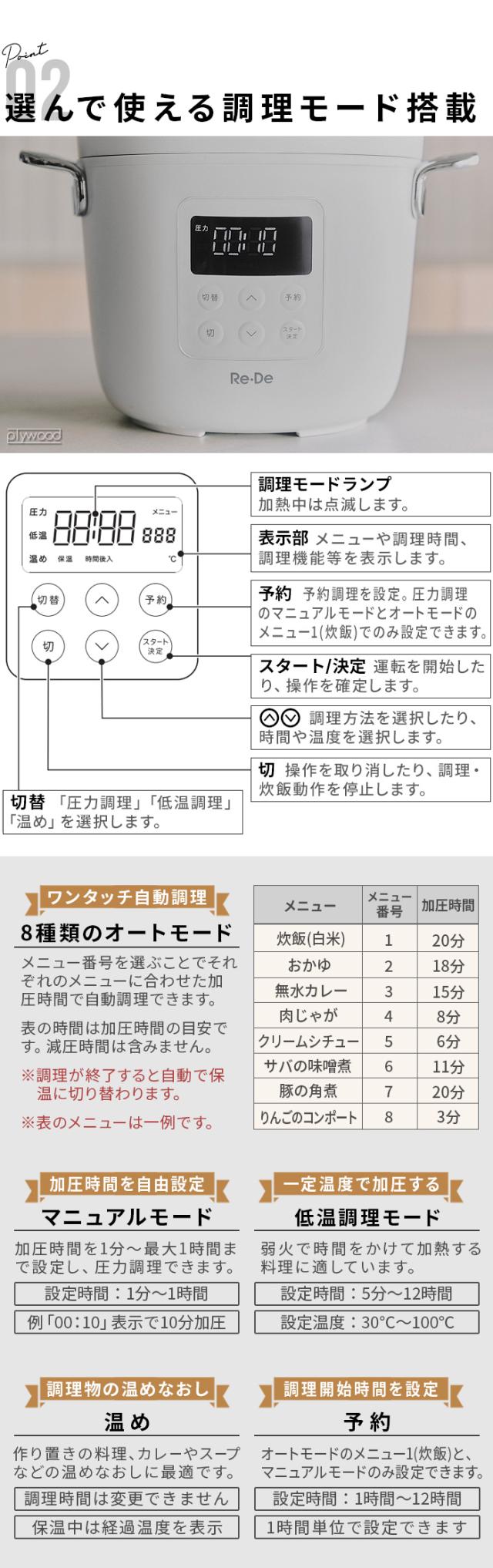 | ・圧力(オートモード、マニュアルモード) ・低温調理 ・温め |