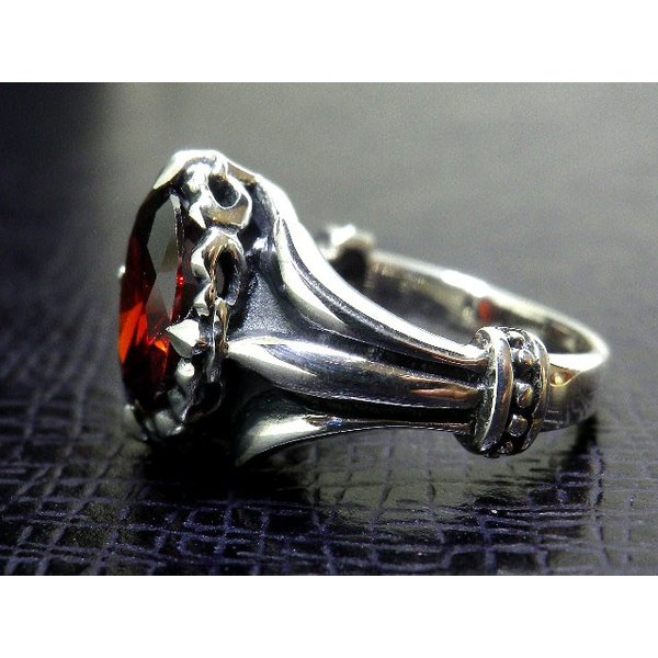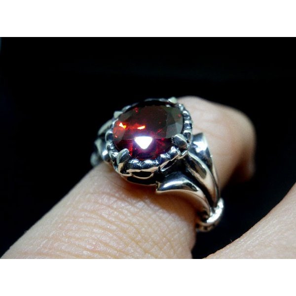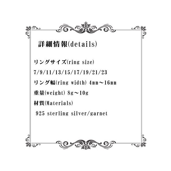 リングサイズ(ring size) 7/9/11/13/15/17/19/21/23 リング幅(ring width) 4mm〜16mm 重量(weight) 8g〜10g 材質(Materials) 925 sterling silver/garnet 【ガーネット】 1月の誕生石。 石言葉は【真実・友愛・貞節】 石の力は、恋人との絆を強め、障害の多い恋を持続、 成就させるといわれる。 気力・体力がわき、明るく前向きにになるといわれる。 身体をリフレッシュさせるといわれる。 ガーネットは最も古い歴史を持つ宝石といわれる。 古代エジプトやギリシャ、ローマでは装飾品としてまた 血止めや薬としても重用された。 ノアの箱舟では暗闇を照らすともし火として使われ 中世においては【石の中に炎が宿っている】と信じられた。