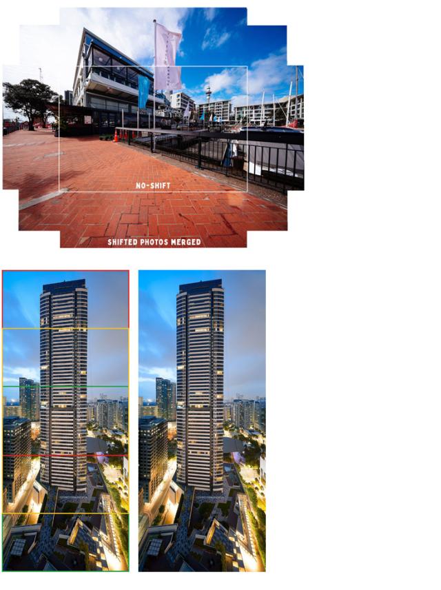 本製品の最大シフト量は、フルフレームカメラで±11mm、中判カメラ(Fujifilm GFX / Hasselblad X1Dなど)で±8mmです。シフト機能により簡単に遠近法による歪みを補正し、建造物をまっすぐに写すことができます。歪みのある画像を補正することで遠近法による歪みを排除し、実際に肉眼で見た際に近い遠近感で撮影していただけます。