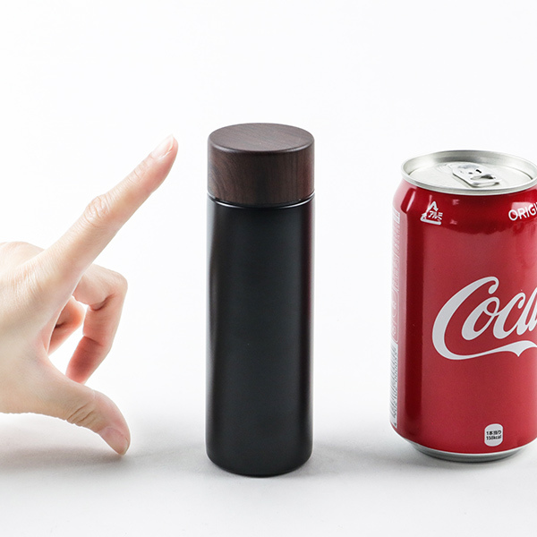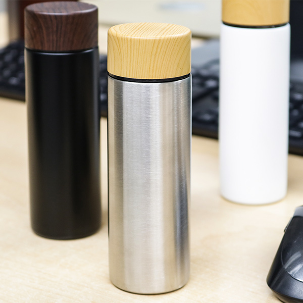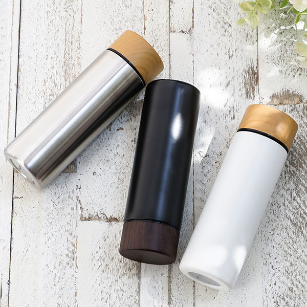 木目調のデザインがおしゃれな、重量約132gの小さなステンレスマグボトルです。保温・保冷両用タイプで、ホットもアイスも美味しい温度を保ち、一年中お使いいただけます。