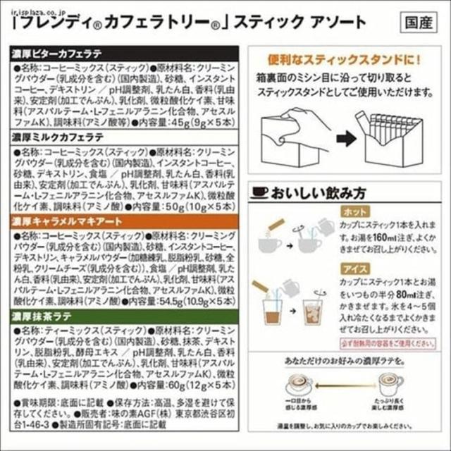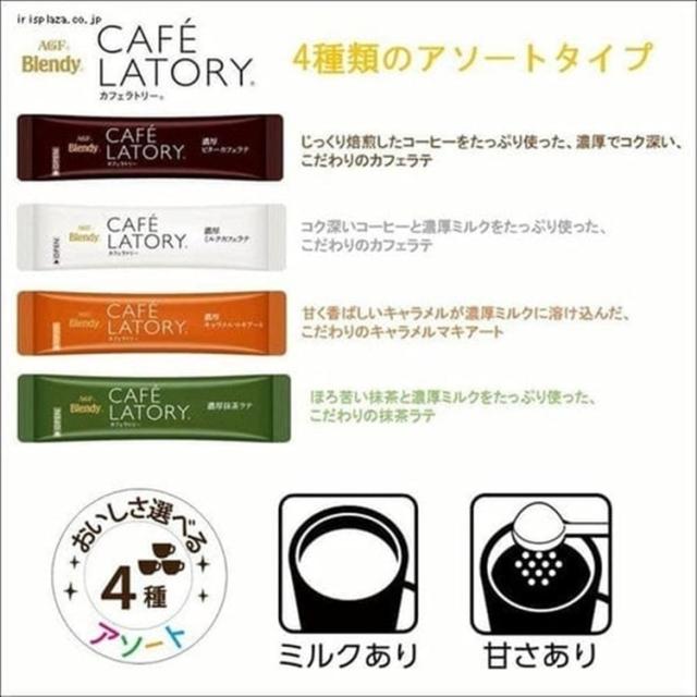 AGF(エージーエフ) 「ブレンディ カフェラトリー」 スティック アソート20本は、濃厚ビターカフェラテ、濃厚ミルクカフェラテ、濃厚キャラメルマキアート、濃厚抹茶ラテのカフェで人気の4つのメニューを詰め合わせたアソートタイプ。