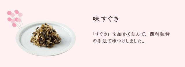 | 千枚漬70g、京のあっさり漬(うすぎり大根115g、かぼちゃきざみ90g)、赤しそむらさきの50g、ゆずの香り50g、味すぐき50g 、さくら漬40g< ※原料事情により、詰合せ内容が変わることがあります。 |