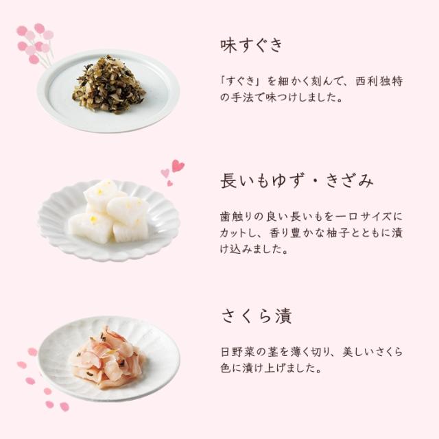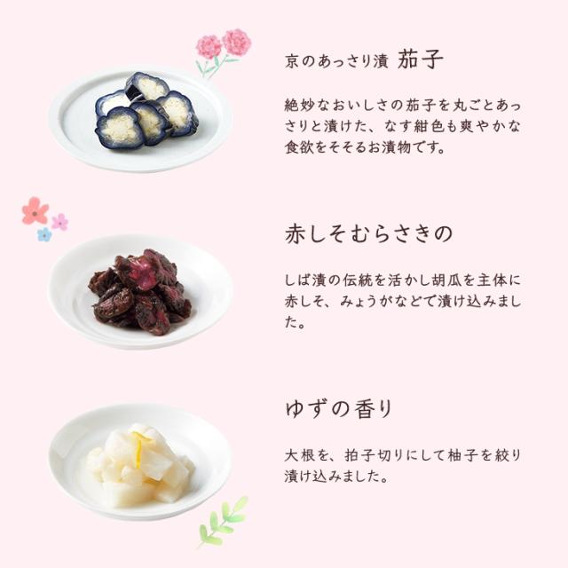 | 千枚漬70g、京のあっさり漬(うすぎり大根115g、茄子1個、かぼちゃきざみ90g)、長いもゆず・きざみ100g、赤しそむらさきの50g、ゆずの香り50g、味すぐき50g 、さくら漬40g ※原料事情により、詰合せ内容が変わることがあります。 |