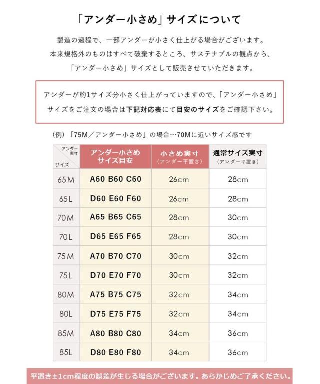 | 65M:A65 B65 C65 65L:D65 E65 F65 70M:A70 B70 C70 70L:D70 E70 F70 75M:A75 B75 C75 75L:D75 E75 F75 80M:A80 B80 C80 80L:D80 E80 F80 85M:A85 B85 C85 85L:D85 E85 F85 65M/アンダー小さめ:A60 B60 C60 65L/アンダー小さめ:A60 B60 C60 70M/アンダー小さめ:A65 B65 C65 70L/アンダー小さめ:D65 E65 F65 75M/アンダー小さめ:A70 B70 C70 75L/アンダー小さめ:D70 E70 F70 80M/アンダー小さめ:A75 B75 C75 80L/アンダー小さめ:D75 E75 F75 85M/アンダー小さめ:A80 B80 C80 85L/アンダー小さめ:D80 E80 F80 ※対応サイズは目安となります。 ※MよりLの方が、カップの横幅が広く肩紐の位置も外側になります。体型により個人差がありますので、下記も合わせてご確認下さい。 ・Mサイズ…A〜Cカップの方、バストの横幅が狭い方、肩幅が狭い方 ・Lサイズ…D〜Fカップの方、バストの横幅が広い方、脇肉までしっかりカバーしたい方 |