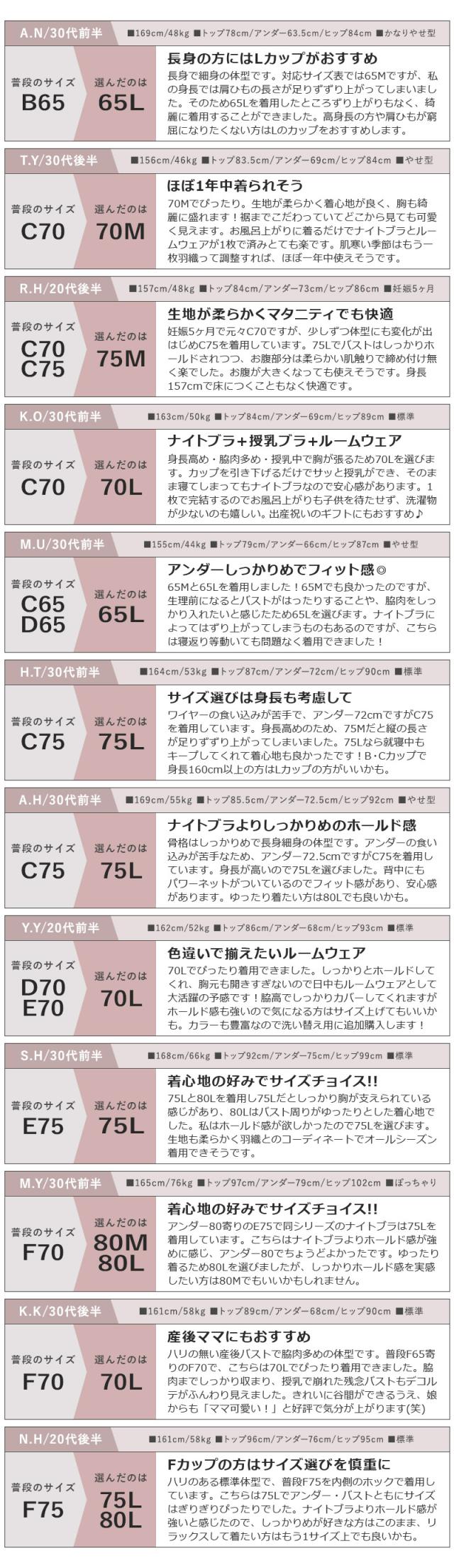 | ※本商品はホールド感を高めた設計で、ナイトブラタイプよりきつめの着用感です。 リラックス感をお求めの方や高身長の方、マタニティ・授乳期に着用される方は1〜2サイズ大きめをお選び下さい。 ※常に商品改良を行っており、ご購入いただくタイミングにより着用感が若干異なる場合がございます。 ▼以下の改良版に順次入替を行っております。 ・脇高でホールド感を高め横流れ防止 ・肩紐を改善しバストをしっかり引き上げ ・アンダーゴムを太くして食い込みを改善 |