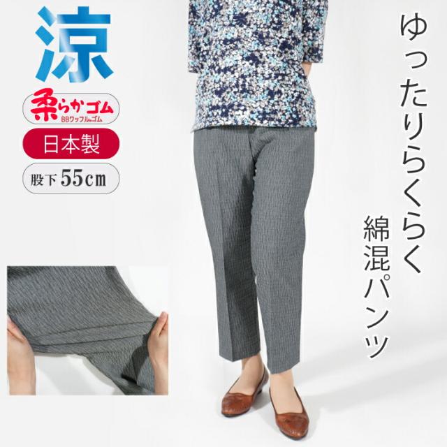 シニアファッション 涼しい おばあちゃん ズボン 80代 70代 日本製 綿混 パンツ 股下55cm 【品番9389】 送料無料 夏 おりなすとちお 母 プレゼント やわらかい ゆったり らくらく ウエストゴム
