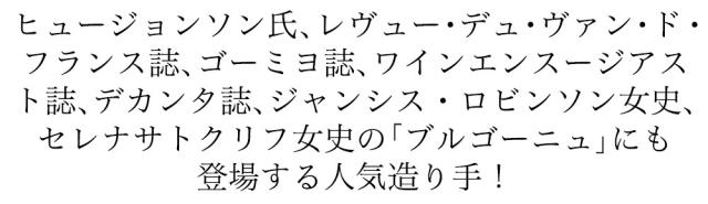 ![]() 家族経営で丁寧に造られるシャブリ もともと4ha程度の小さなドメーヌから始まり、1959年に4代目にあたるベルナール・ドゥフェ氏が財産分与で受け取った2haの畑と共に独立。その後少しずつ畑を増やしていき、シャブリで約12ha、1級を11ha、プティ・シャブリを2haほど所有するに至りました。 良いワインを造るには、良いブドウが必要だ 「良いワインを造るには、良いブドウが必要だ」という信念の下、家族経営(小規模)で、手間を惜しまずに丁寧にワイン造りが行われています。ベルナール・ドゥフェのスタイルには家族に伝わる経験が詰まっています。この経験こそが良いワインを造る源となっています。 ワインは葡萄園で決まる また2009年からエコセールの管理下での有機栽培を開始し、2012ヴィンテージで認証を取得。更なる品質の向上が期待される今後も目が離せない生産者です。 豊満であると同時に明快、かつ繊細で畑も優れているので今一度注目すべきドメーヌ セレナサトクリフ女史は、「きれいで樽を使わない良く造られたワイン」と「ブルゴーニュ」の中で高評価しています。 クラスマン誌も、「豊満であると同時に明快、かつ繊細で畑も優れているので今一度注目すべきドメーヌだと言えよう」と述べています。 ヒュージョンソン氏もシャブリの項で、「豊かなフレーバーを持つ鉱物を含んだかのような独特の辛口ワイン」★★-★★★としておすすめの生産者の1人にこのベルナール・ドゥフェを挙げています。 |