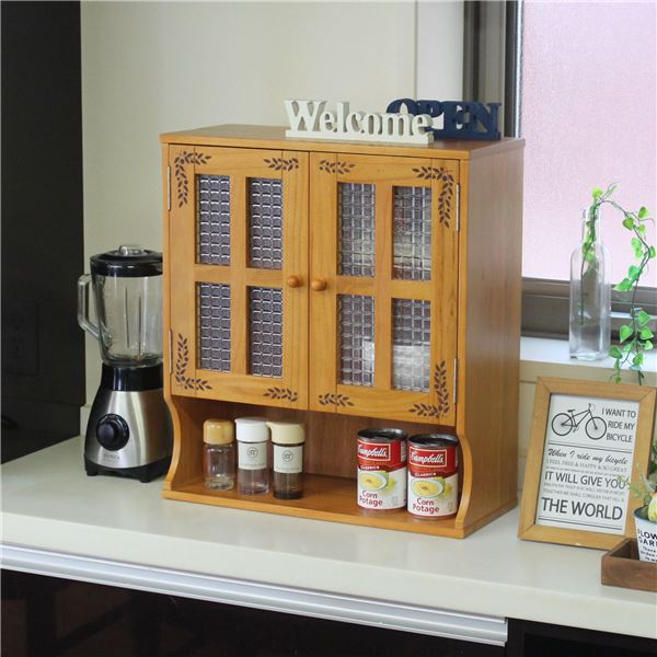リーフ柄 カウンター上収納 調味料ラック〔ライトブラウン〕 上置き 引き戸 収納 棚 両面開閉 木製 幅45cm おしゃれ キッチン 完成品 【北海道・沖縄・離島配送不可】