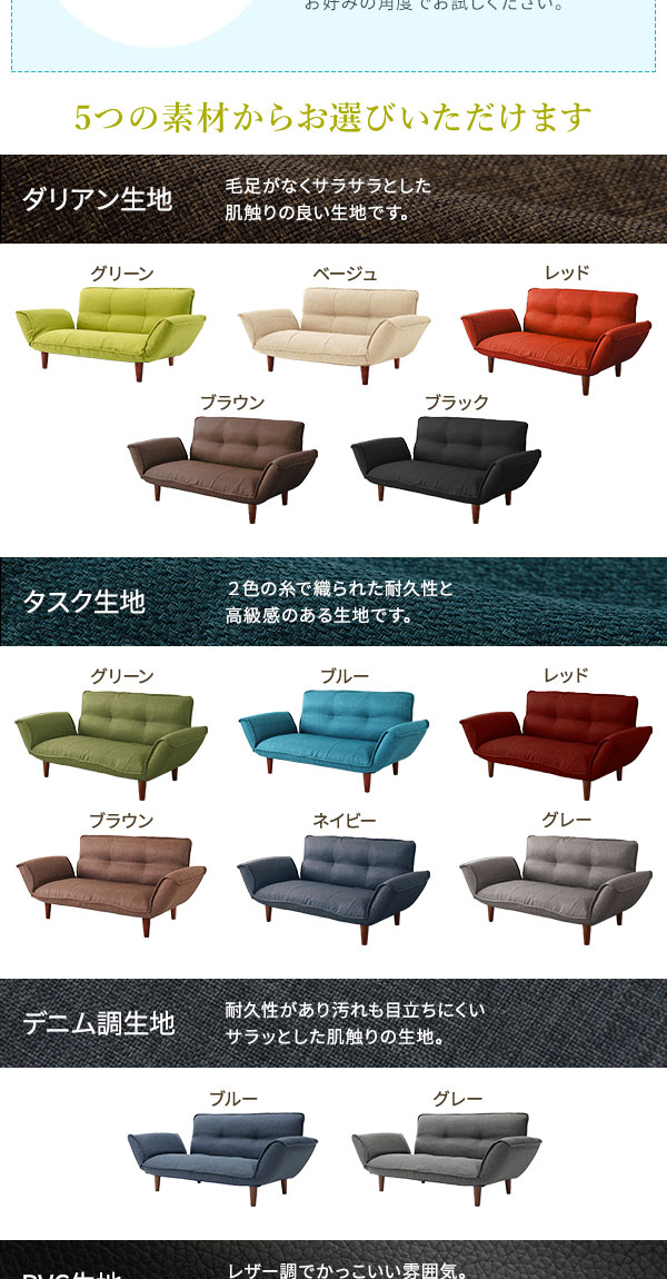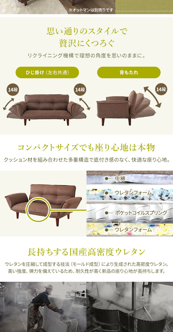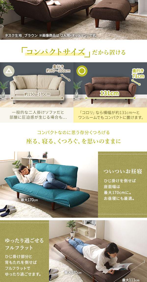・通常131cmとコンパクトな横幅なのに、肘掛けを倒すことで最大170cmまで広がります。