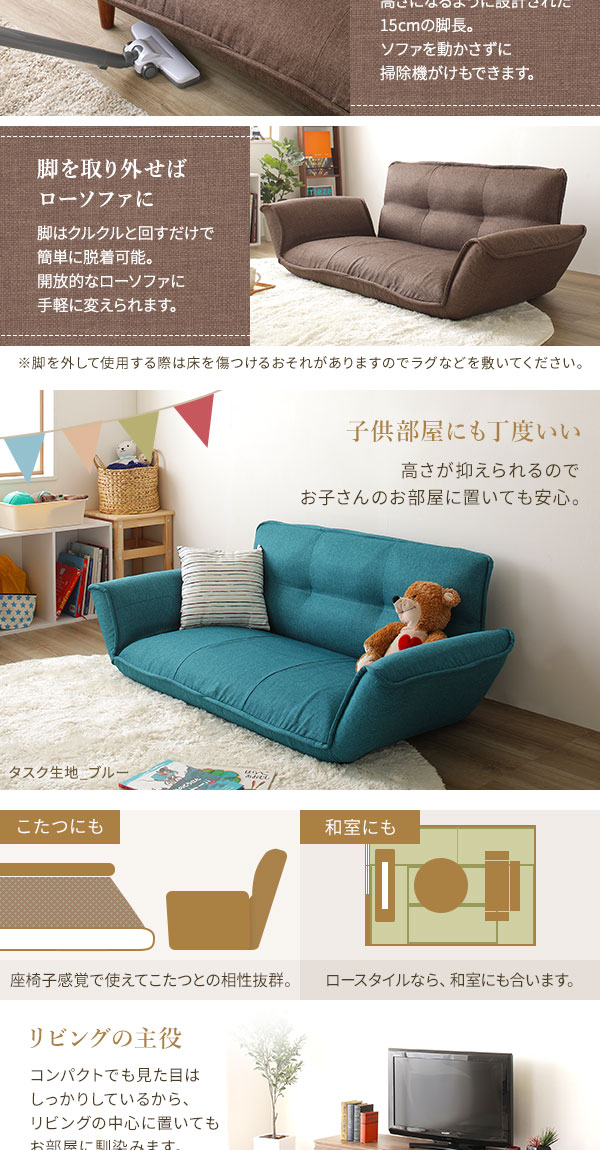 ・脚を外せばローソファにもなります。より圧迫感の少ないお部屋にしたいときに