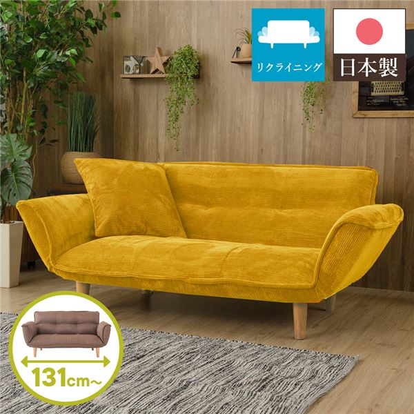 こちらは「日本製 リクライニングソファー/カウチソファー 【2人掛け コールテン生地 イエロー】 脚部:ナチュラル 肘付き 脚付き」の商品ページです。