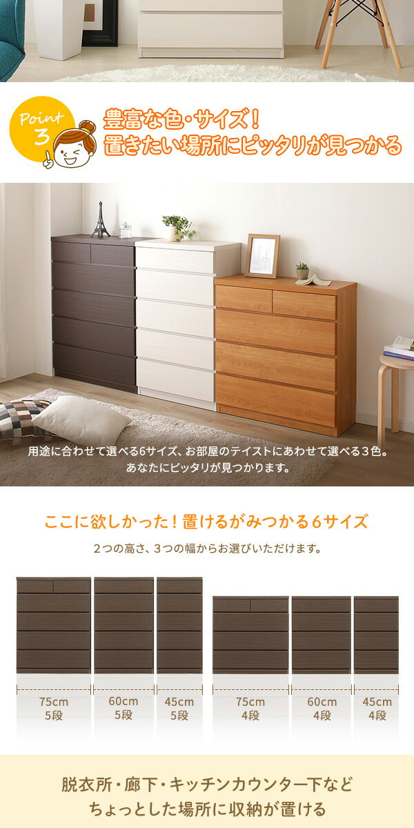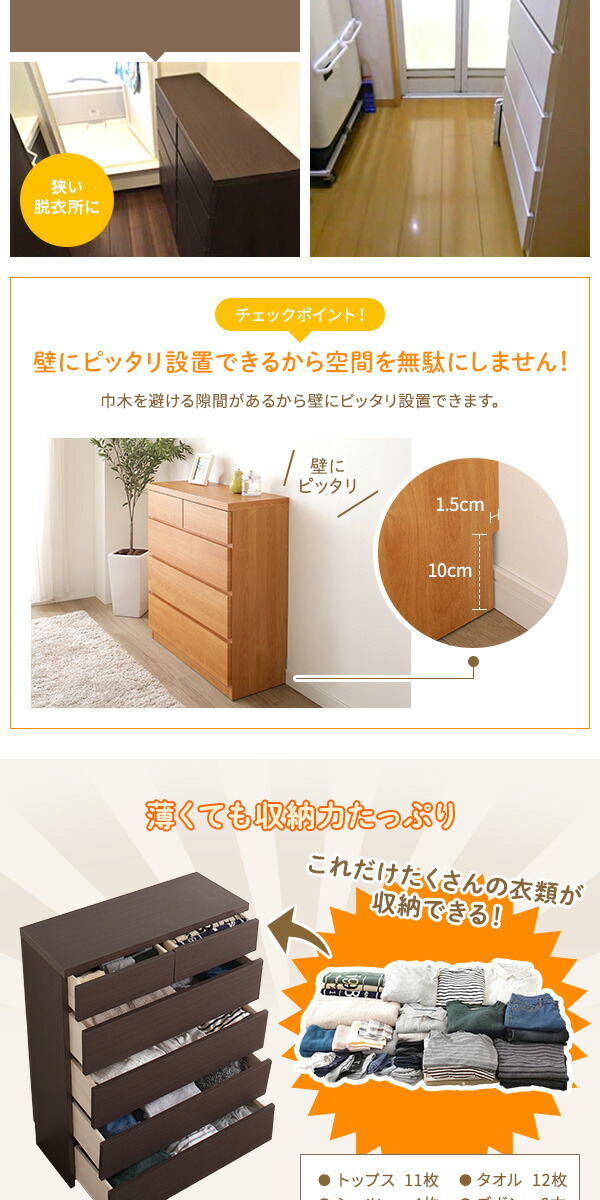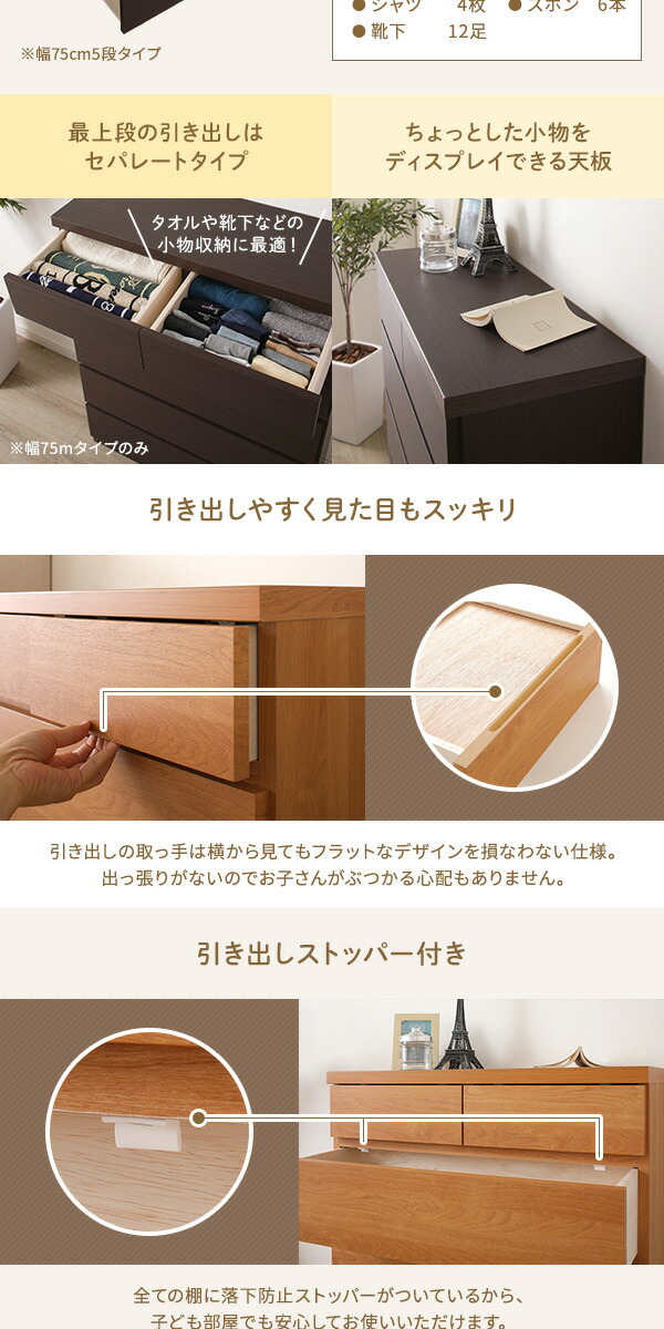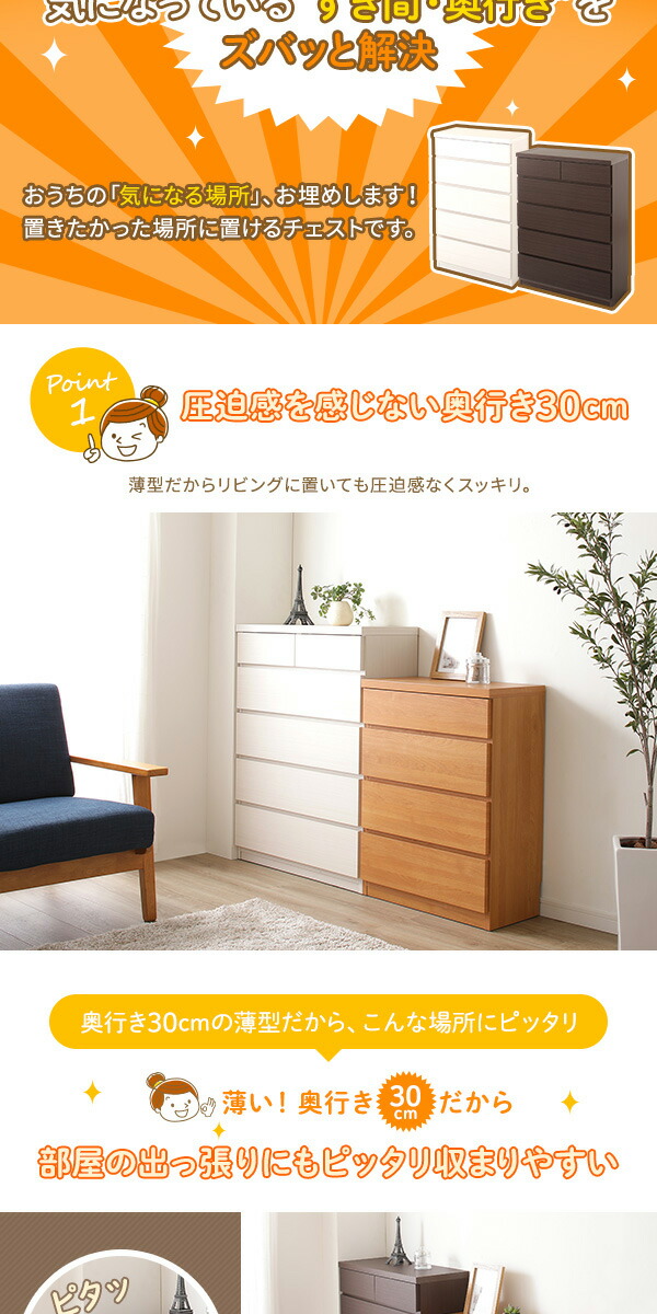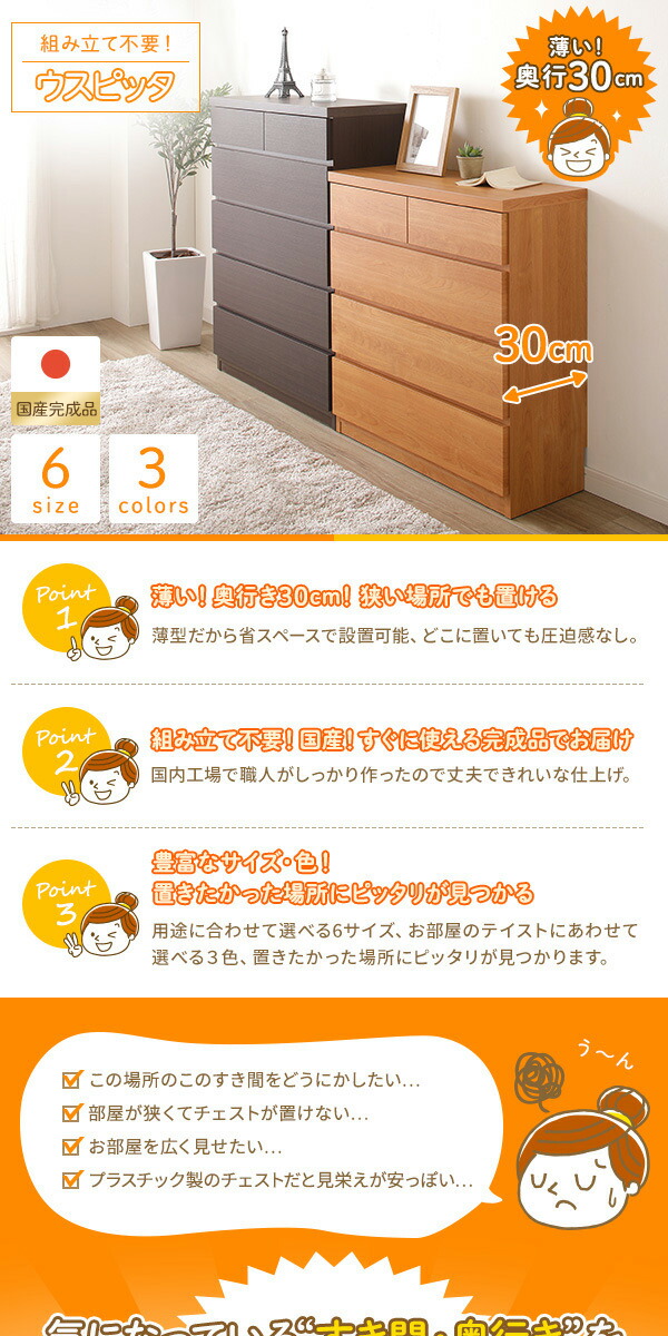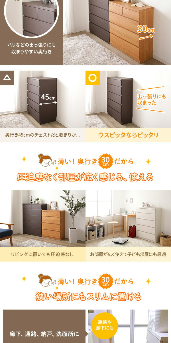 頑丈薄型チェスト/収納棚 〔5段 幅75cm ナチュラル木目調 〕 奥行30cm 日本製 『ウスピッタ』 〔完成品〕 転倒防止具付き 【北海道・沖縄・離島配送不可】