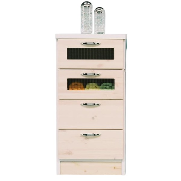 パイン材を使用したカントリー調チェスト。上段2段の小窓にはクロスペンガラス使用。引出しやすい金具取っ手付き。引き出し(大)はレール付。