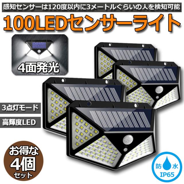 センサーライト 100LED 4個セット 屋外 ソーラーライト 4面発光 高輝度 防犯 人感 防水 屋外照明 300°照明範囲 防犯ライト 3つ知能モード 太陽光発電 庭 玄関 駐車場 通路 ガーデンライト 大活躍