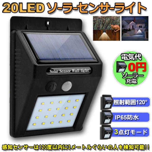 センサーライト ソーラーライト 20LED 屋外 3つ知能モード 高輝度 防犯 人感 防水 屋外照明 120°照明範囲 防犯ライト 夜間自動点灯 太陽光発電 庭 玄関 駐車場 通路 ガーデンライト 大活躍
