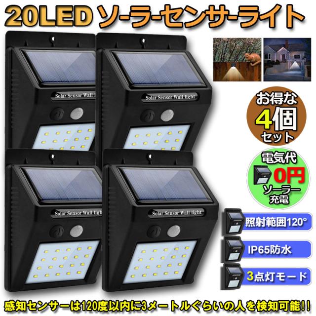 20LED センサーライト 4個セット 屋外 ソーラーライト 3つ知能モード 高輝度 防犯 人感 防水 屋外照明 120°照明範囲 防犯ライト 夜間自動点灯 太陽光発電 庭 玄関 駐車場 通路 ガーデンライト 大活躍
