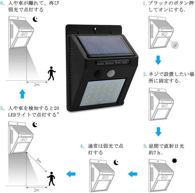 ]【高輝度20LEDライト】20個高輝度LEDライトを備え、従来より明るくなり、照明の範囲も5mに達して、最大感知角度 は120°になります。また、低赤外線・低UVで発熱がほとんどない為、虫を集まりにくくて、夏場に迷惑を掛けません。