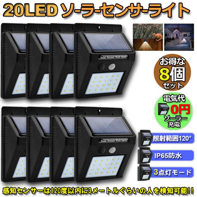 20LED センサーライト 8個セット 屋外 ソーラーライト 3つ知能モード 高輝度 防犯 人感 防水 屋外照明 120°照明範囲 防犯ライト 夜間自動点灯 太陽光発電 庭 玄関 駐車場 通路 ガーデンライト 大活躍