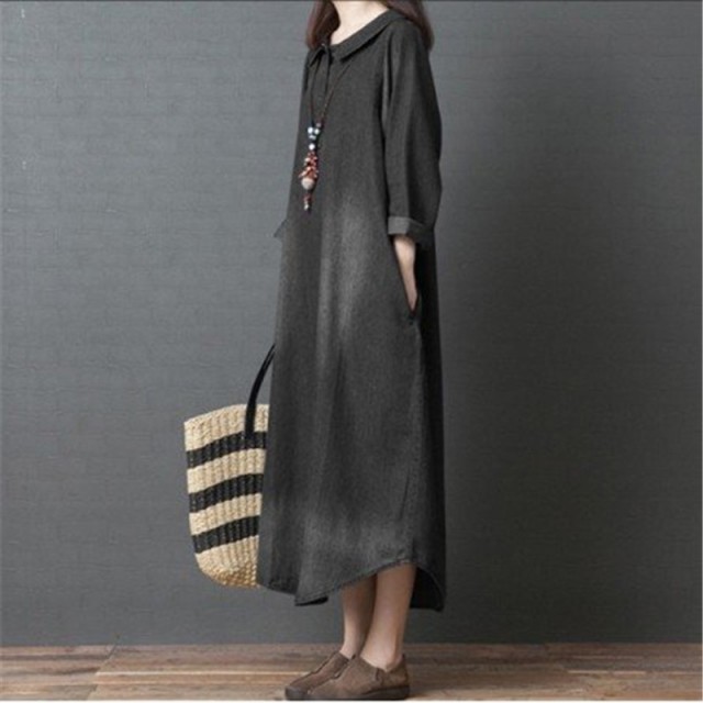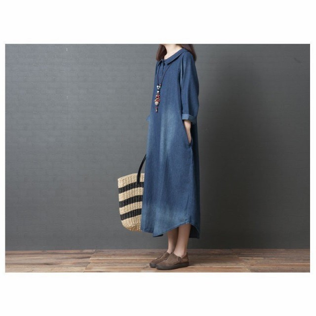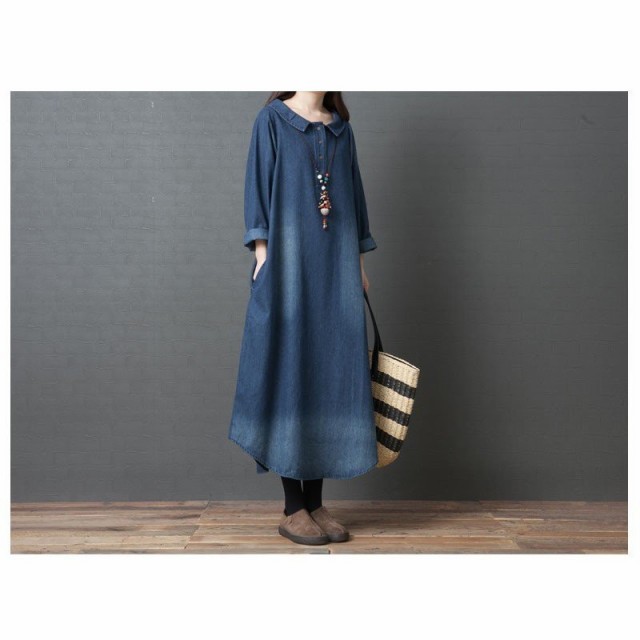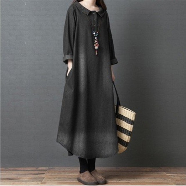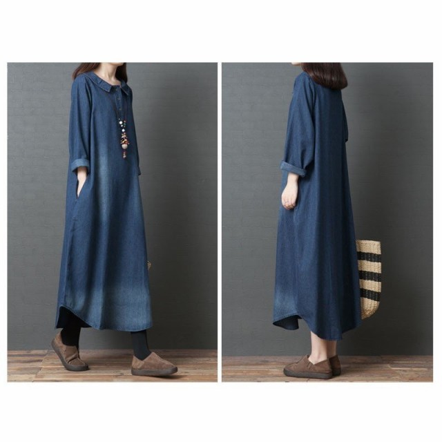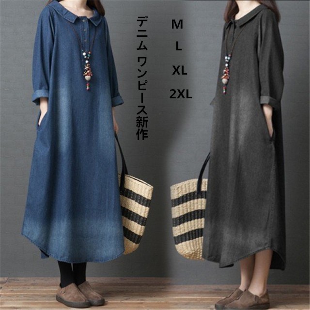 ワンピース デニム レディース 40代 ロング デニムワンピース チュニック 長袖 ゆったり 大きいサイズ 体型カバー 着痩せ 秋冬新作